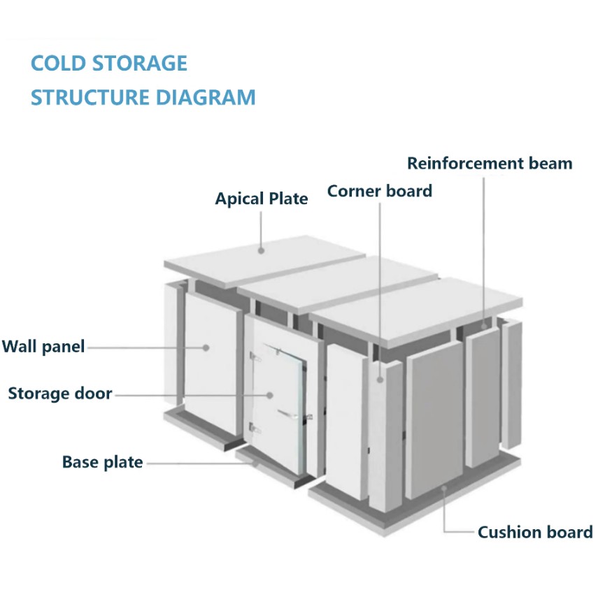 -        Szigetelő szerkezet:      Nagy teljesítményű szigetelőanyagok (például poliuretán szigetelőpanelek) alkotják a hűtőkamra falait, padlóját és mennyezetét, maximalizálva a külső hőszigetelést és minimális energiafogyasztást biztosítva.